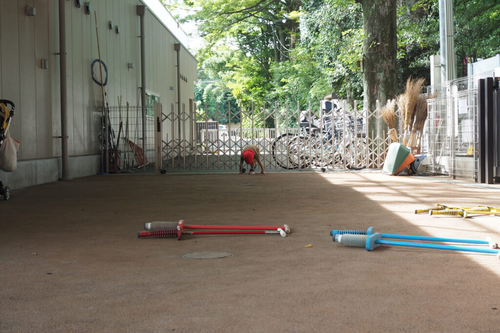 一生懸命に並べるから、何をするのかな?と見ていると、N君、並んだホッピングから離れていきます。「まさか、ならべただけ!?」と思ってみていると、壁の際に行って見事なクラウチングスタートのポーズ。