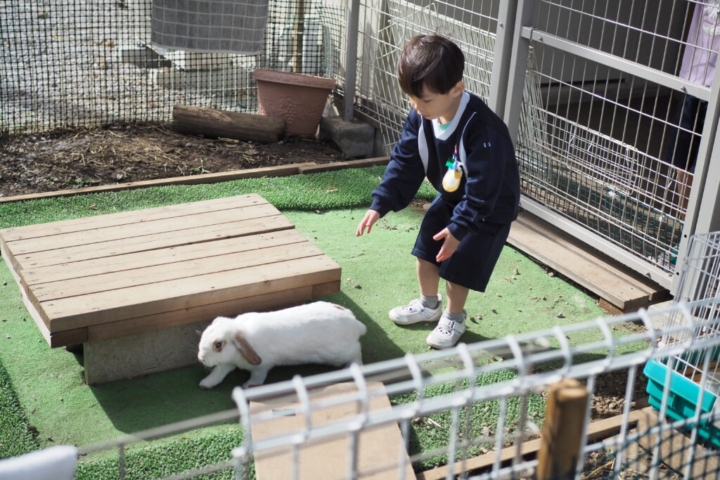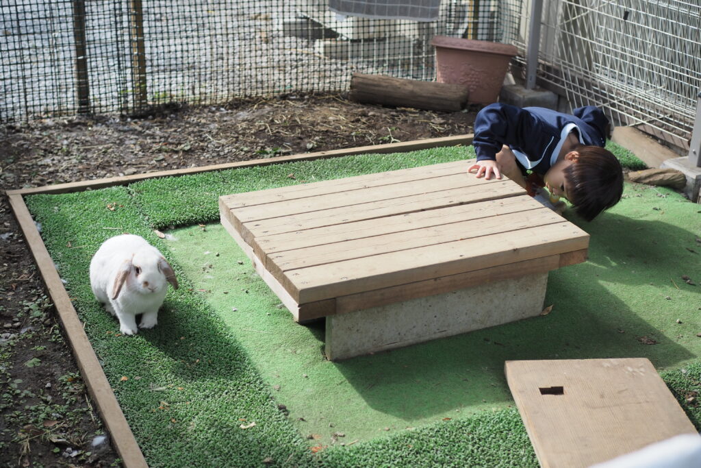 「うさぎひろば」(うさぎの放し飼いコーナー)に行くと、年少こぐま組の子がうさぎと触れ合っていました。今日、「うさぎひろば」で遊んでいたのは”ぺこちゃん”。