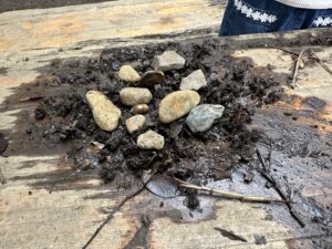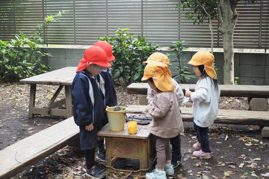 こりす組の子どもたちが焚火コーナーで落ち葉、ドングリ、木っ端を使って焼き芋ごっこをしていました。そこへ、みかん組の子どもたちがやってきて仲間に入れてもらっていました。