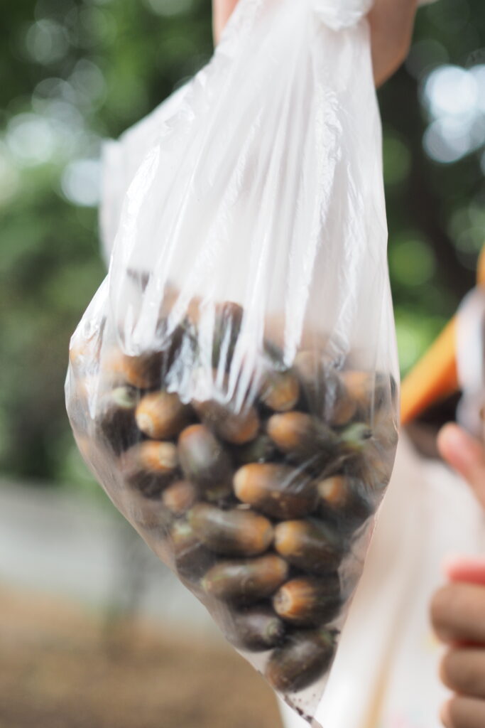 ちいさなドングリを何個も拾い、袋いっぱいに集まっています。