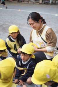 こども園になる前は、年少組が小さい組でしたが、乳児組があると時々に年少さんがお兄さん、お姉さんをしている姿があり、「自己信頼感」を獲得している時期に自分より小さい人たちとの交流はとても良い影響をもたらしてくれているように思います。見ていてほっこりなひと時でした。