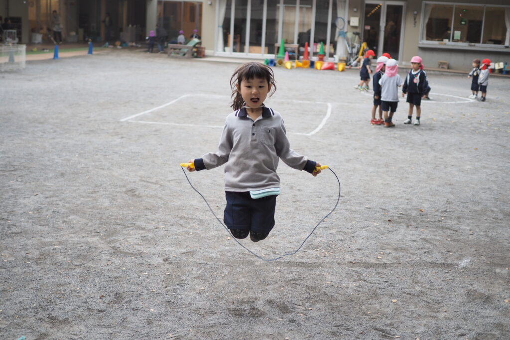 年中組は運動会の景品として個人持ちの「縄跳び」がプレゼントされました。年中組もも組のTちゃんが「ねぇ、せんせい なわとび できるように なったから しゃしんとって」と声をかけてくれました。