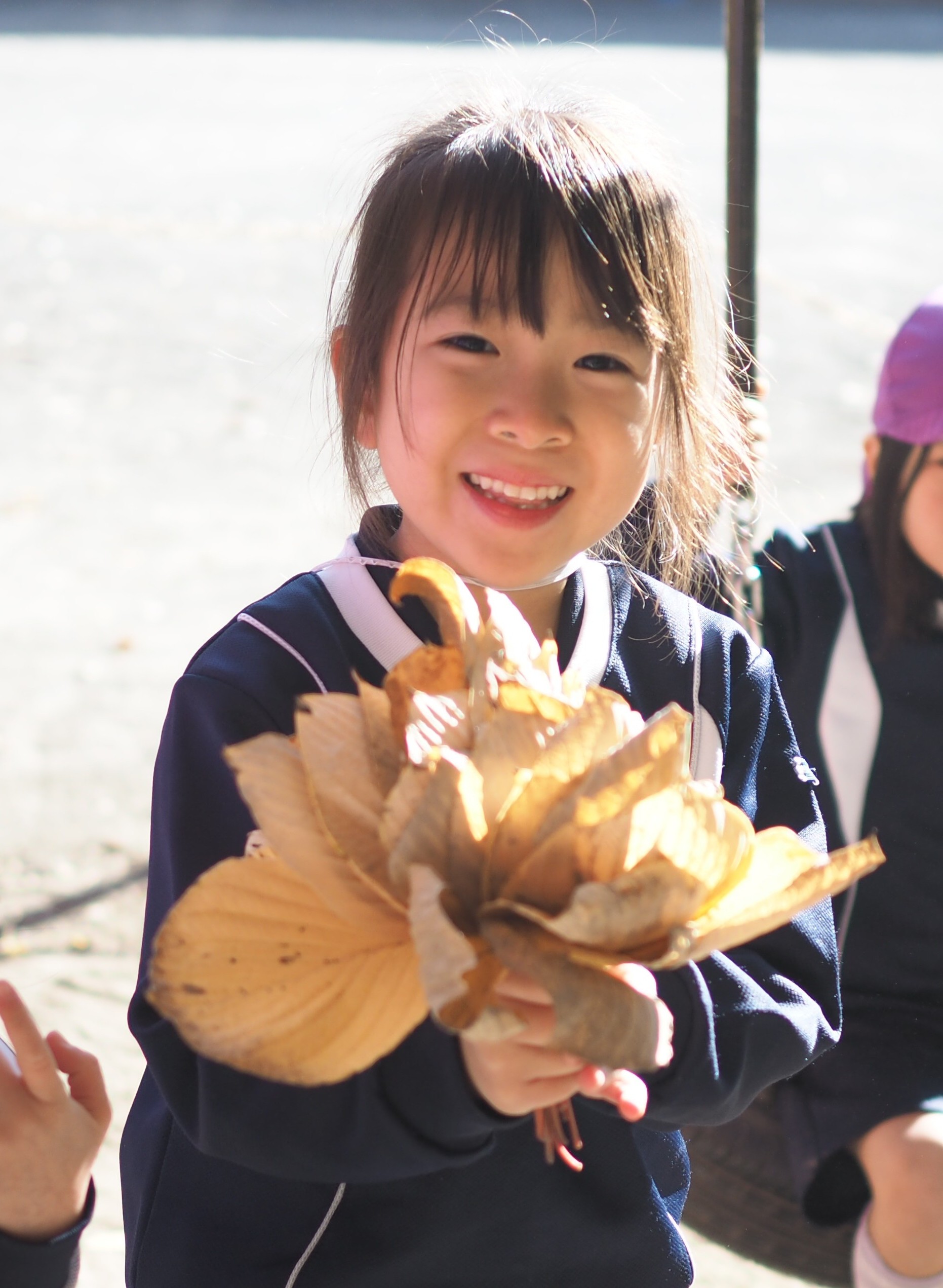 園庭の落ち葉は、早朝に保安の先生や理事長先生がきれいに掃除をしてくれているのですが、それでも、数十分も経てば、園庭が落ち葉の絨毯で覆われます。落ち葉など自然物の良さは、種類はあったとしても、一つひとつの形が違う事なのではないでしょうか。