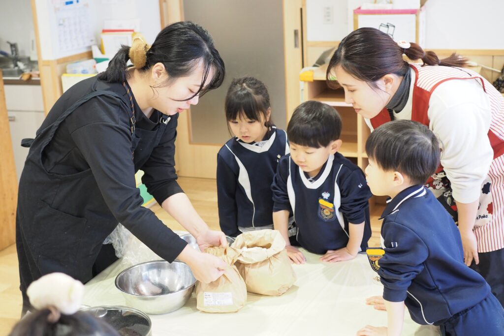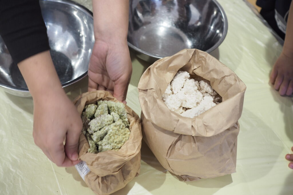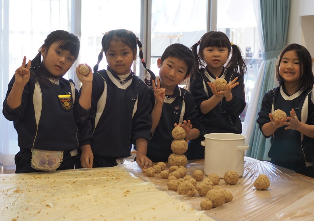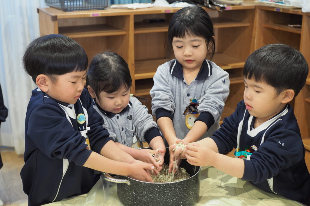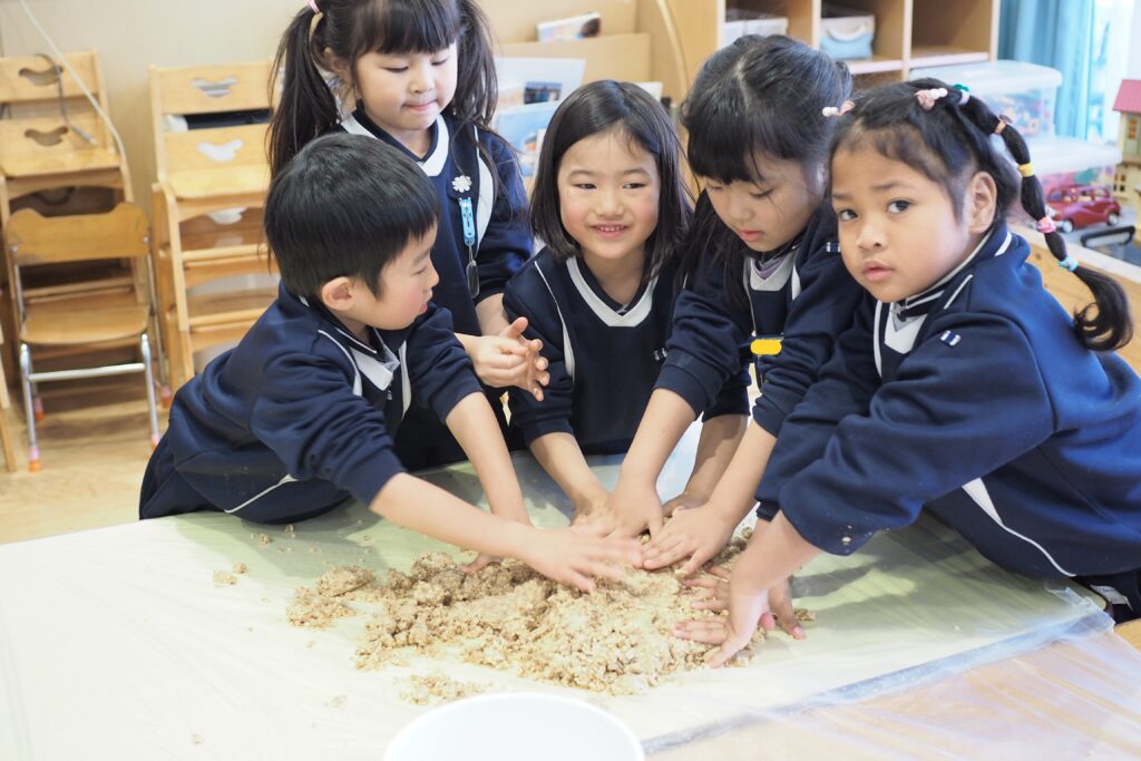 昨年度から始まった味噌づくり。年長組のお泊り保育の豚汁づくりにも活用されました。今年も遊びの時間に子どもたちが入れ替わりで参加をして、麹や大豆に触れる経験ができました。