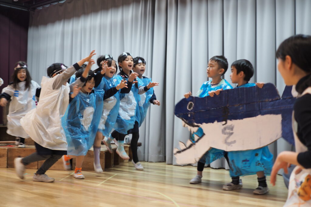 神明の劇の会は、子ども達の中から出てきた表現と保育者の教育的な配慮の両面から劇を構成し、子どもと保育者が共に創り上げていく活動です。